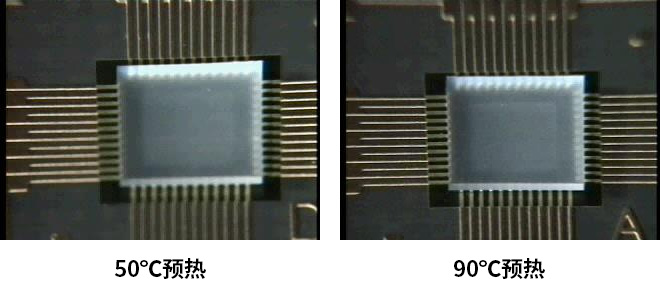 加热使胶的粘度大幅下降,从而提高胶粘剂在元件底部的流动性能,使点胶速度、效率增加.