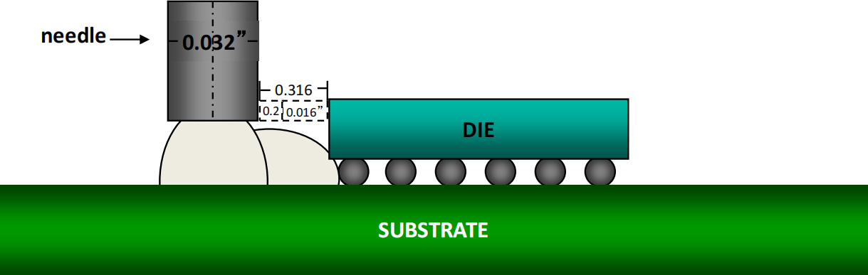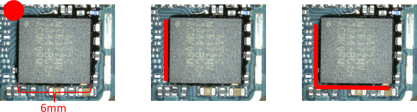 边角点胶: 在其中一个角上点胶,胶水流向另外一边;通常使用于尺寸6mm*6mm的小芯片;