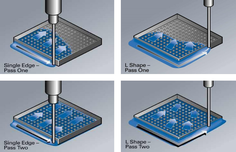 L型点胶: 适用于中、大尺寸芯片,而且要求填充速度较快,胶量要求大的场合.